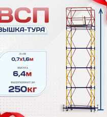 Вышка ВСП-250 шириной 0.7х1.6 метра - компактная модель с увеличенной поверхностной нагрузкой преимущественно для внутренних работ и работ в зауженном пространстве. Легко собирается без необходимости использования специального инструмента (все элементы соединяются флажковыми механизмами). Ее просто перемещать по объекту за счет наличия больших прорезиненных колес, которые также снабжены фиксаторами положения. Позволяют тонко подрегулировать высоту вышки и зафиксировать ее от нежелательных перемещений во время работ. Данную модель вышки можно доращивать по высоте дополнительными секциями (не входят в стоимость) до 7 метров. Секции вышки снабжены диагональными металлическими стяжками. Они обеспечивают дополнительную устойчивость при резких порывах ветра. Настил изготовлен из фанеры толщиной 10 мм и имеет люк для безопасного и удобного перемещения во время работ. Если докупить еще один настил, можно работать вдвоем: вышка выдерживает вес до 250 кг.
